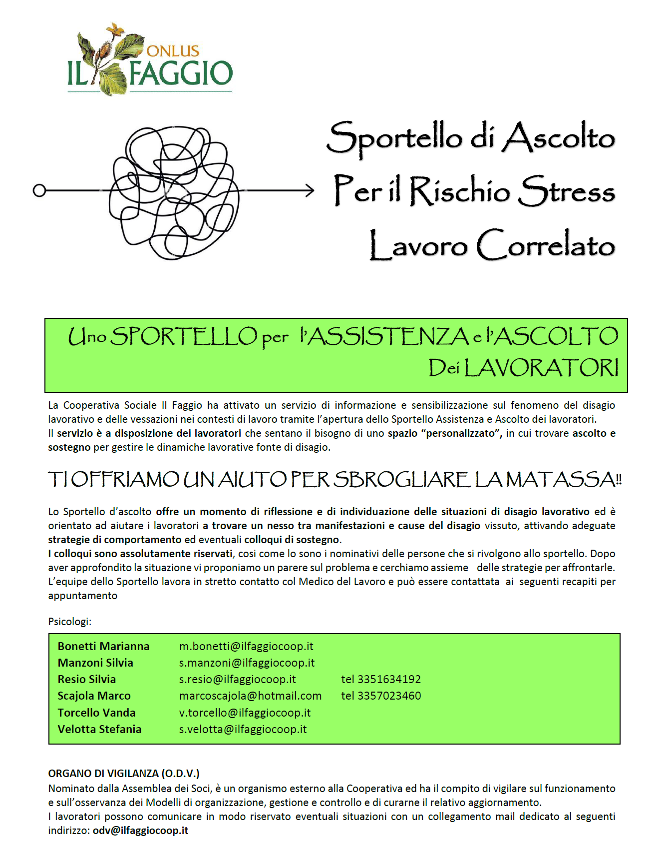 Lo sportello Assistenza e Ascolto per i Lavoratori per il 2026 riguardante il rischio stress lavoro correlato è stato attivato dalla Cooperativa e svolge un lavoro di assistenza e ascolto per tutti i lavoratori de Il Faggio.